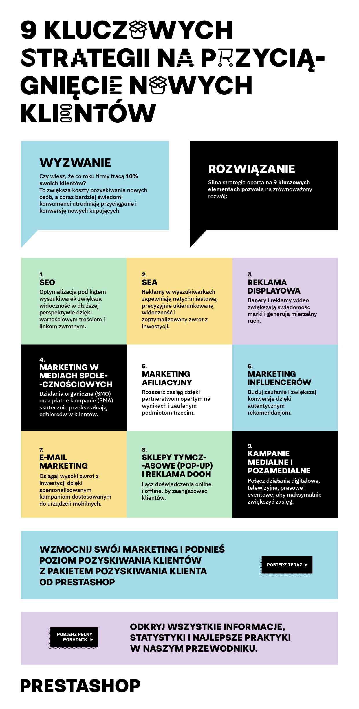 Aby odpowiedzieć na to pytanie, zespół PrestaShop przygotował 9 sposobów na pozyskiwanie klientów, które pomogą Ci przyciągnąć potencjalnych kupujących do Twojego sklepu internetowego i sprawić, by dokonali zakupu.
